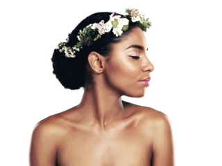 Beauty, profile and flower crown for wellness with a black woman isolated on transparent background. Skincare, natural and wreath with the face of a young model on PNG for health or sustainability