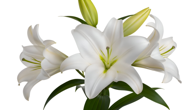 Elegant white lily blossoms with green leaves on transparent background