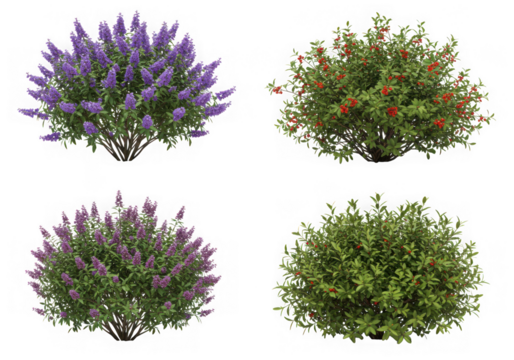 Four flowering shrubs isolated on transparent background