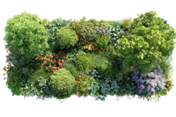 A vibrant collection of lush green plants and flowering shrubs isolated on white background arranged artistically
