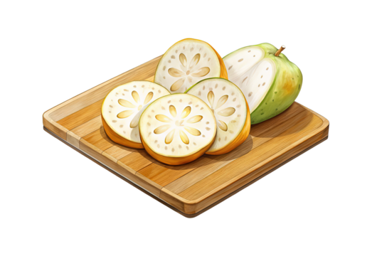 Artistic depiction of sliced fruit with a flowerlike pattern on wood tray
