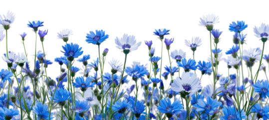 Scattered white daisies with yellow centers isolated on transparent background. Flying white flowers isolated on white background.