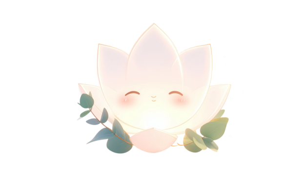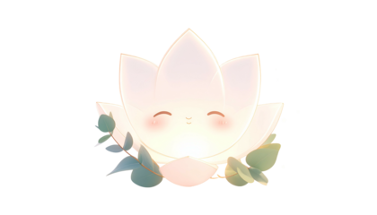 Glowing white lotus flower with smiling face and surrounding greenery, isolated on black