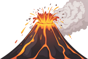 Cartoon erupting volcano, with flowing lava and smoke plumes, cutout, PNG isolated on transparent background