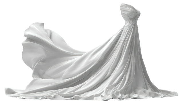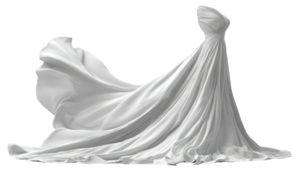 Elegant woman in flowing dress appearing to levitate on transparent background