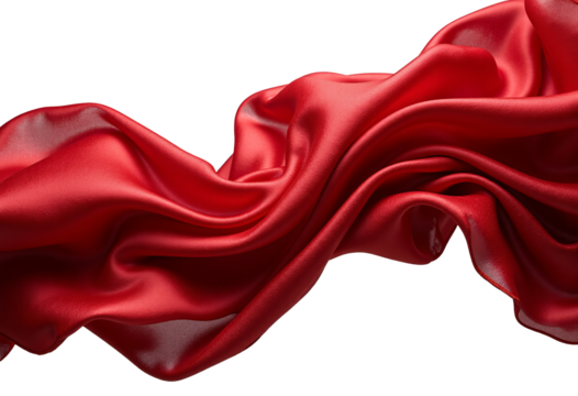 Flowing red satin fabric gently drapes isolated on transparent background, creating a visually striking effect.
