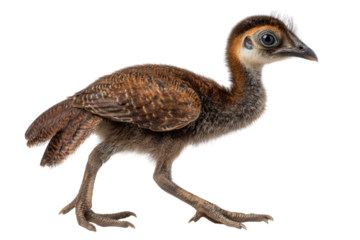 A young, fluffy peafowl chick stands gracefully, showcasing its intricate brown and black patterned plumage and curious dark eyes on a transparent background. background removed