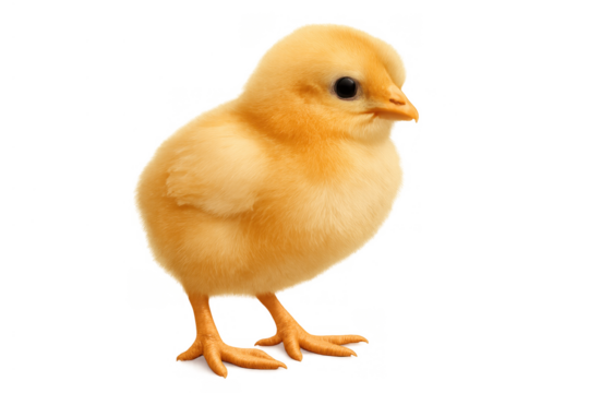 A fluffy yellow chick standing on a white background. its soft feathers and curious expression. ideal for animal-themed projects or educational materials