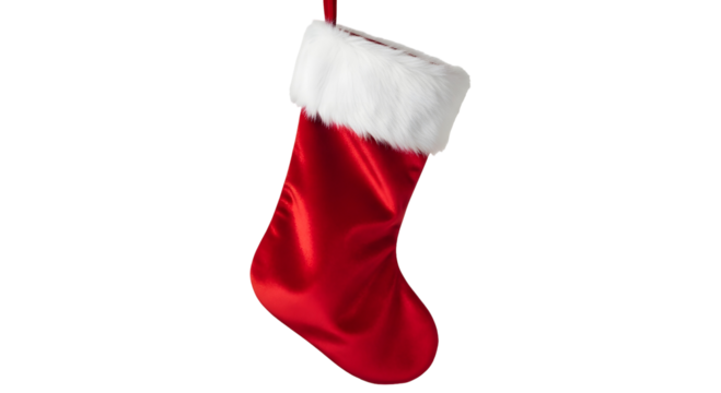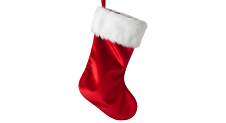A classic festive red christmas stocking with a white fluffy fur cuff isolated on transparent background
