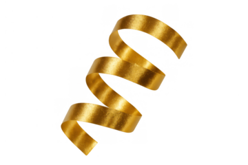 Golden curly ribbon streamer on transparent background, celebrating festive party events, bright shimmering decoration element