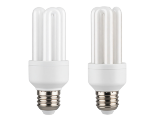 Two compact fluorescent light bulbs with spiral tubes and screw bases.