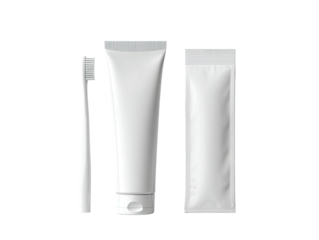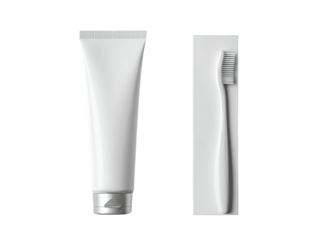 White tube, cap, toothbrush in box, simple, flat lay on black background