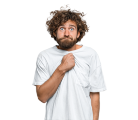A man with messy, curly hair and a beard looks flustered, pulling at his white t-shirt, possibly struggling to put it on or adjusting it.
