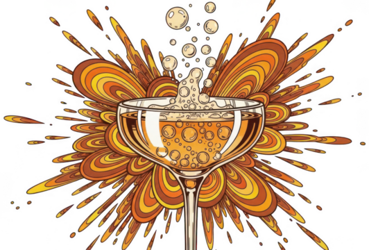 Valentine Retro pop art illustration of champagne glass exploding with festive bubbles and psychedelic abstract shapes