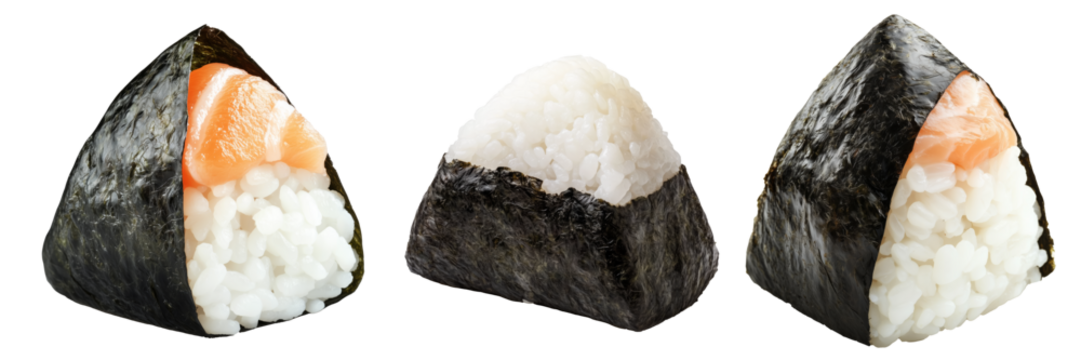 Japanese salmon onigiri rice ball wrapped in nori seaweed, isolated on white background, Asian cuisine concept