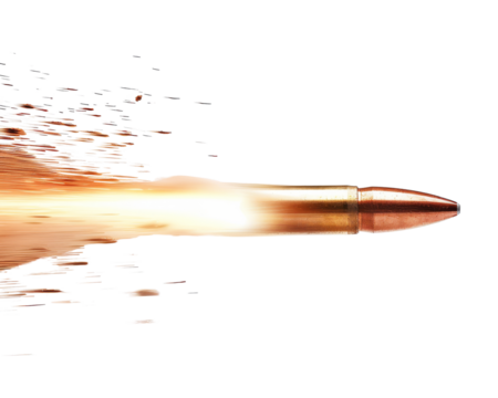 A bullet in flight, leaving a trail of smoke and debris. The image is dramatic and impactful.