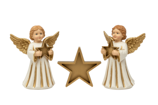 Two cute angel figurines with golden wings and robes hold stars, flanking a larger golden star against a dark transparent background. background removed