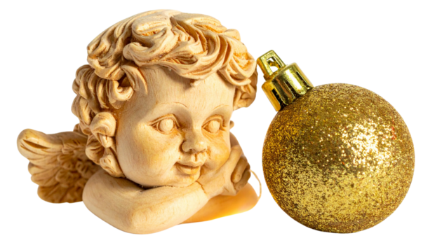 Wooden Angel and Gold Ball Ornament Pair, isolated on transparent background