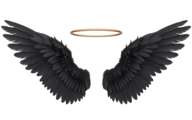 Mysterious dark angel wings with a golden halo hover, evoking fantasy, mystery, and divine power.