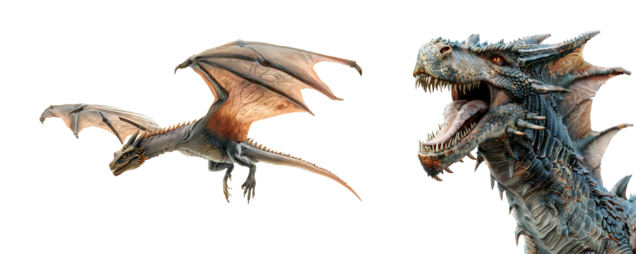 Close up and flying dragon set in full body, Isolated on Transparent Background, PNG