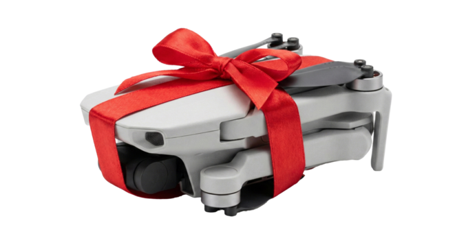 A grey foldable drone wrapped with a red gift bow, transparent background