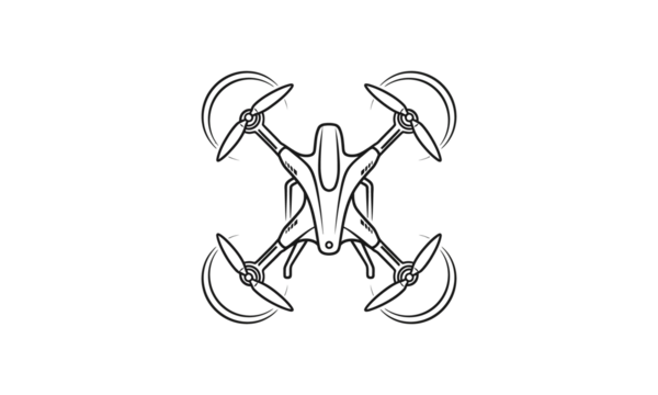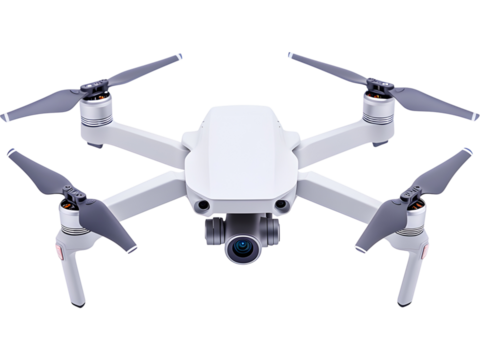 White quadcopter drone with camera, isolated on transparent background, ideal for technology visuals, aerial content themes, drone service ads, and modern gadget designs.