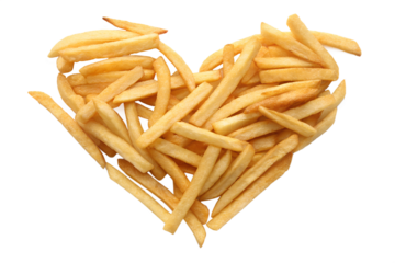 A pile of french fries is arranged in the shape of a heart isolated on transparent background