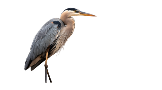 great blue heron bird standing tall, elegant wildlife pose, isolated on white background