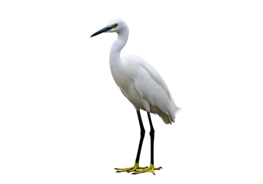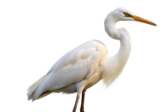 a solitary white heron stands gracefully against a plain background showcasing its elegant form and long legs. bird's distinctive features and serene presence