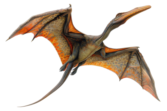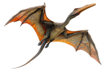 Flying Pterosaur with vibrant wing patterns depicted in a dynamic pose on a white background.