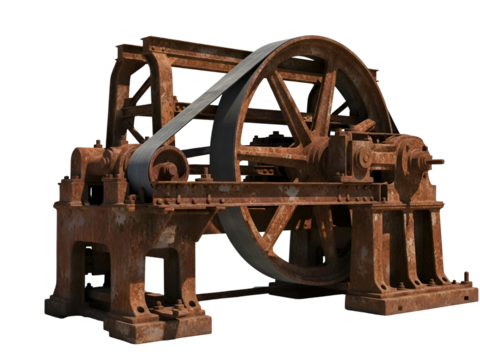 Vintage Rusty Industrial Power Transmission Machine with Large Flywheel Isolated on Transparent B...