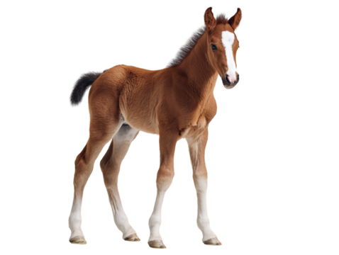Graceful baby horse foal standing tall showcasing soft brown coat and youthful elegance isolated on transparent background PNG