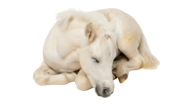 Isolated miniature white horse rests quietly with closed eyes, the perfect companion animal