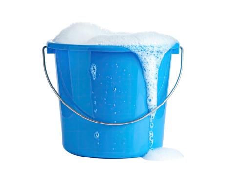 A blue bucket overflows with fluffy white bubbles, isolated on black background