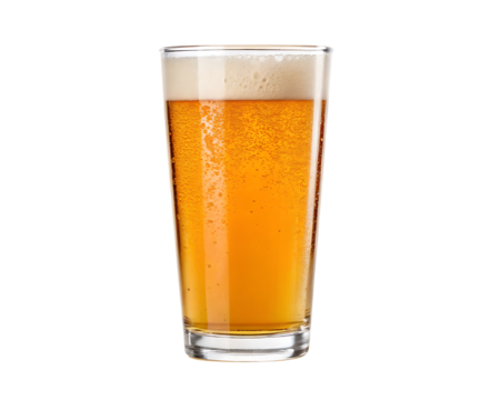 A chilled beer glass with condensation, filled with a light lager, foam sitting gently on top, set to highlight its crisp and clean appearance isolated on a Transparent background, PNG file.