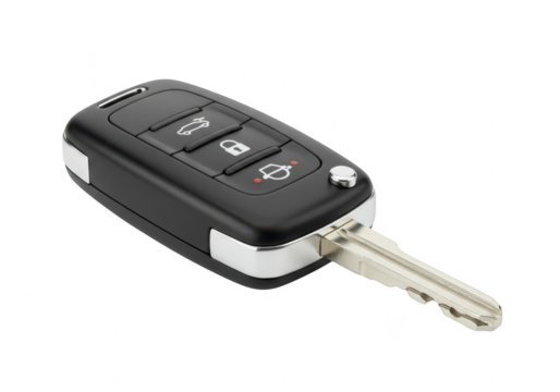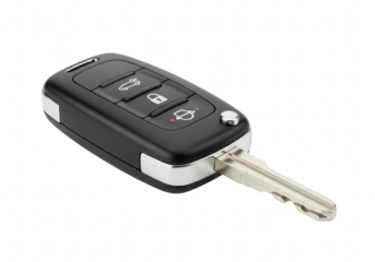 Vehicle remote key fob and car key side by side, providing automobile access and security on a transparent background