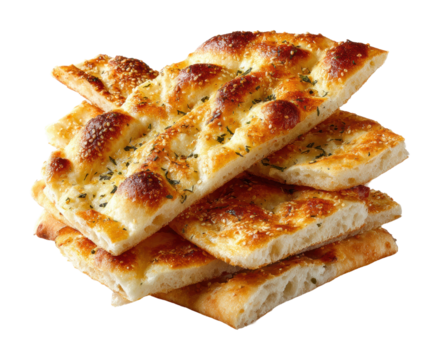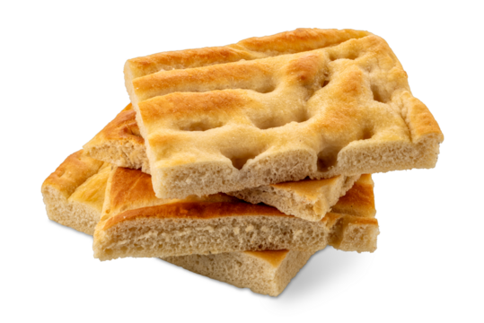 Set of focaccia bread isolated on a white transparent background, Italian bread, usually flavored with olive oil and herbs.