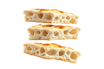 A stack of three delicious slices of plain focaccia bread with bubbly texture and toasted spots isolated on transparent background