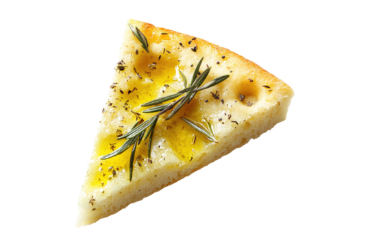 Slice of rosemary focaccia bread drizzled with olive oil isolated on white or transparent, PNG