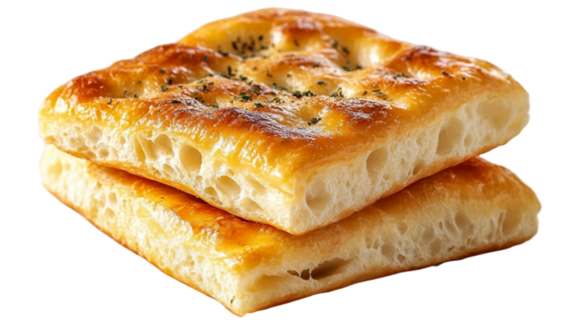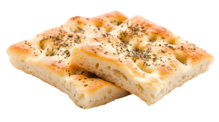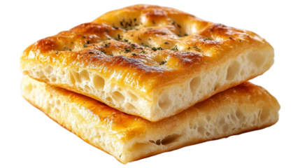 Two pieces of golden-brown Italian focaccia breads isolated on white background. Suitable for marketing or business purposes. PNG file