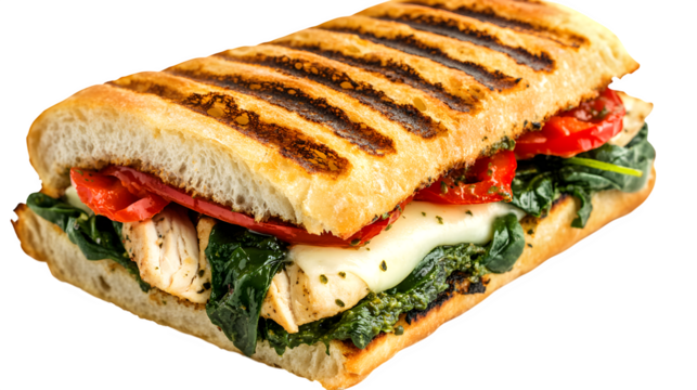 Pesto chicken panini with roasted red peppers, mozzarella cheese, and spinach on focaccia bread, isolated on a transparent background