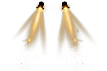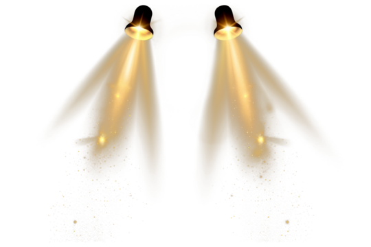 A black metallic studio Fresnel spotlight with open barn doors emitting bright warm white light on a black stand, isolated against a clean transparent studio background with copy space,