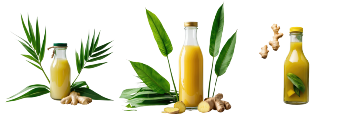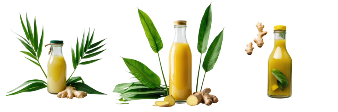 Ginger juice in clear glass bottles accompanied by young pandan leaves and fresh ginger pieces on transparent background, isolated for clarity and focus on ingredients