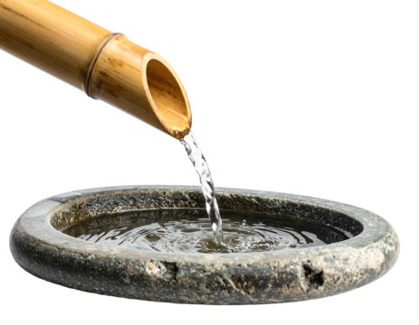 A close-up shot of water pouring from a bamboo spout into a stone basin, set against a black backdrop