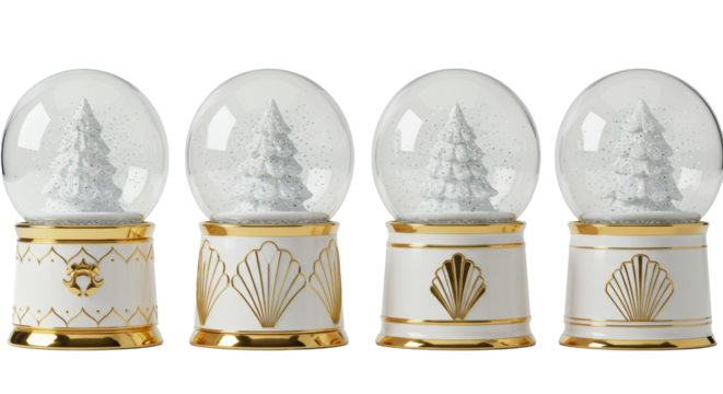 six pristine empty snow globes in a precise row, featuring matte white ceramic and polished metallic gold art deco bases, focus stacked on a transparent studio background. Professional holiday