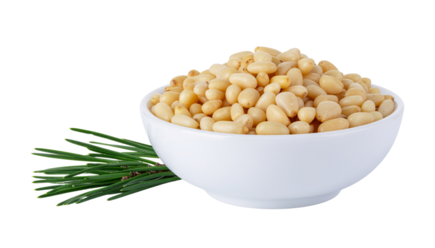 Healthy organic meal featuring shelled pine nuts served in ceramic bowl on white background with sharp focus