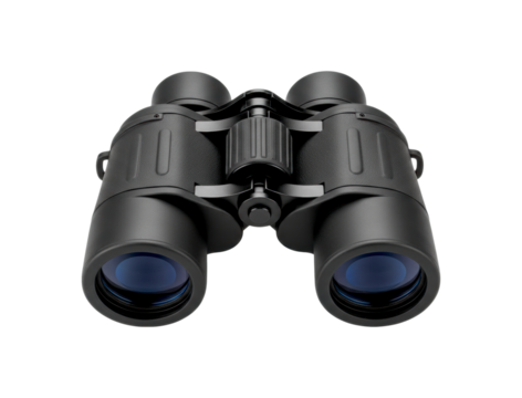 Modern black tactical binoculars with large blue-coated lenses and a central focus wheel, shown from a front perspective for observation or surveillance