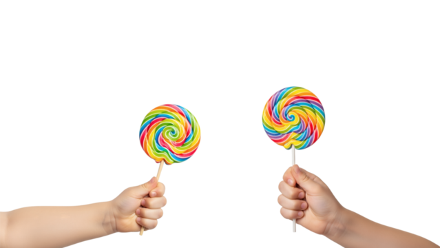Two hands, holding vibrant, rainbow-colored spiral lollipops against a stark black backdrop. The focus is on the sweet treats