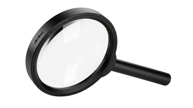 A black handled magnifying glass with a large white lens is positioned diagonally, isolated on a transparent background, cutout, PNG
