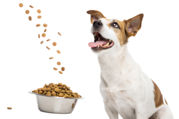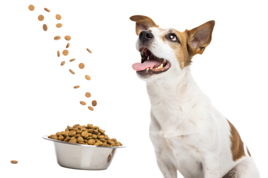 Ultra realistic dog sitting and looking at food being poured from above into a bowl, dog tongue slightly out, excited and focused expression, dry dog food kibble falling vertically into a pet bowl, ma